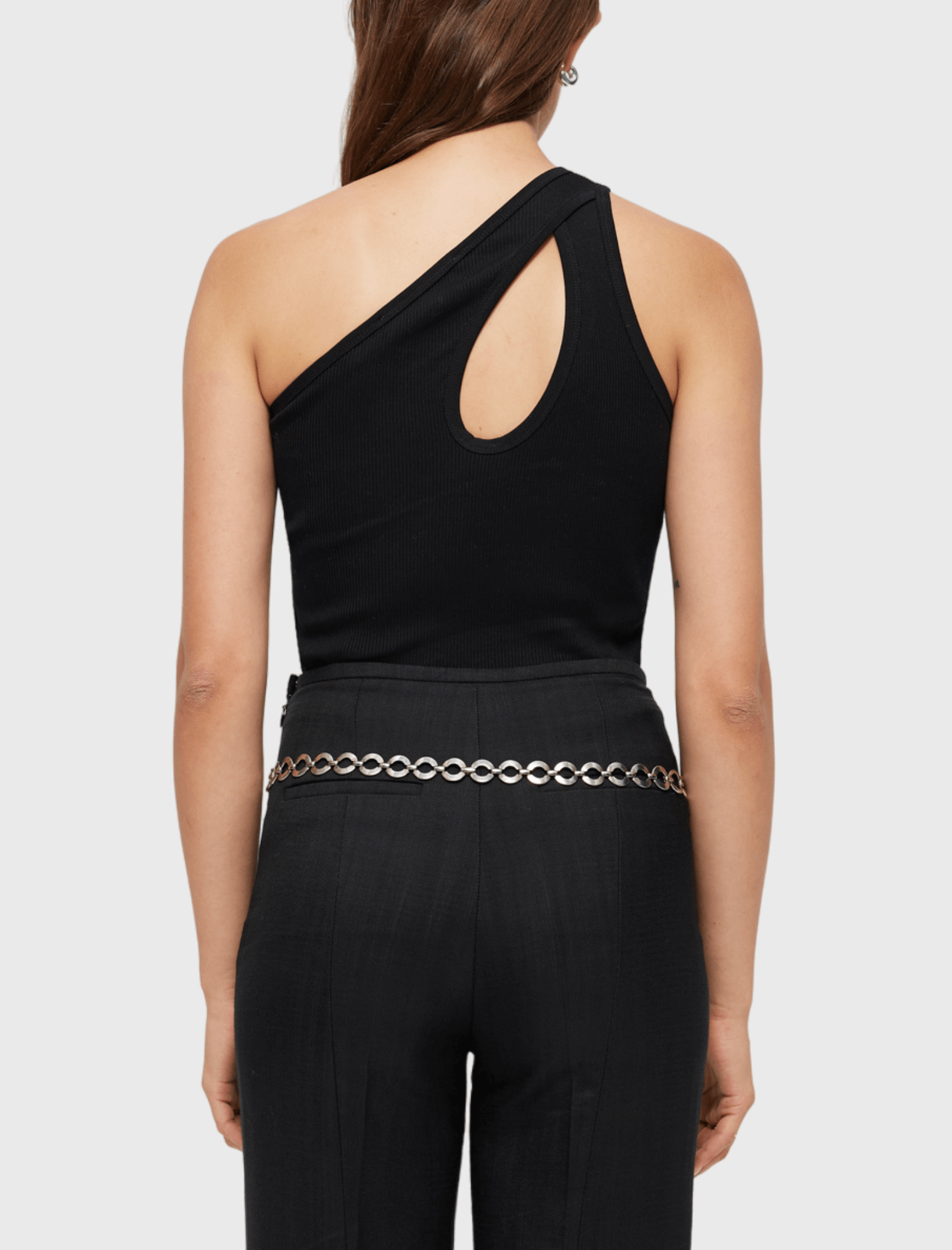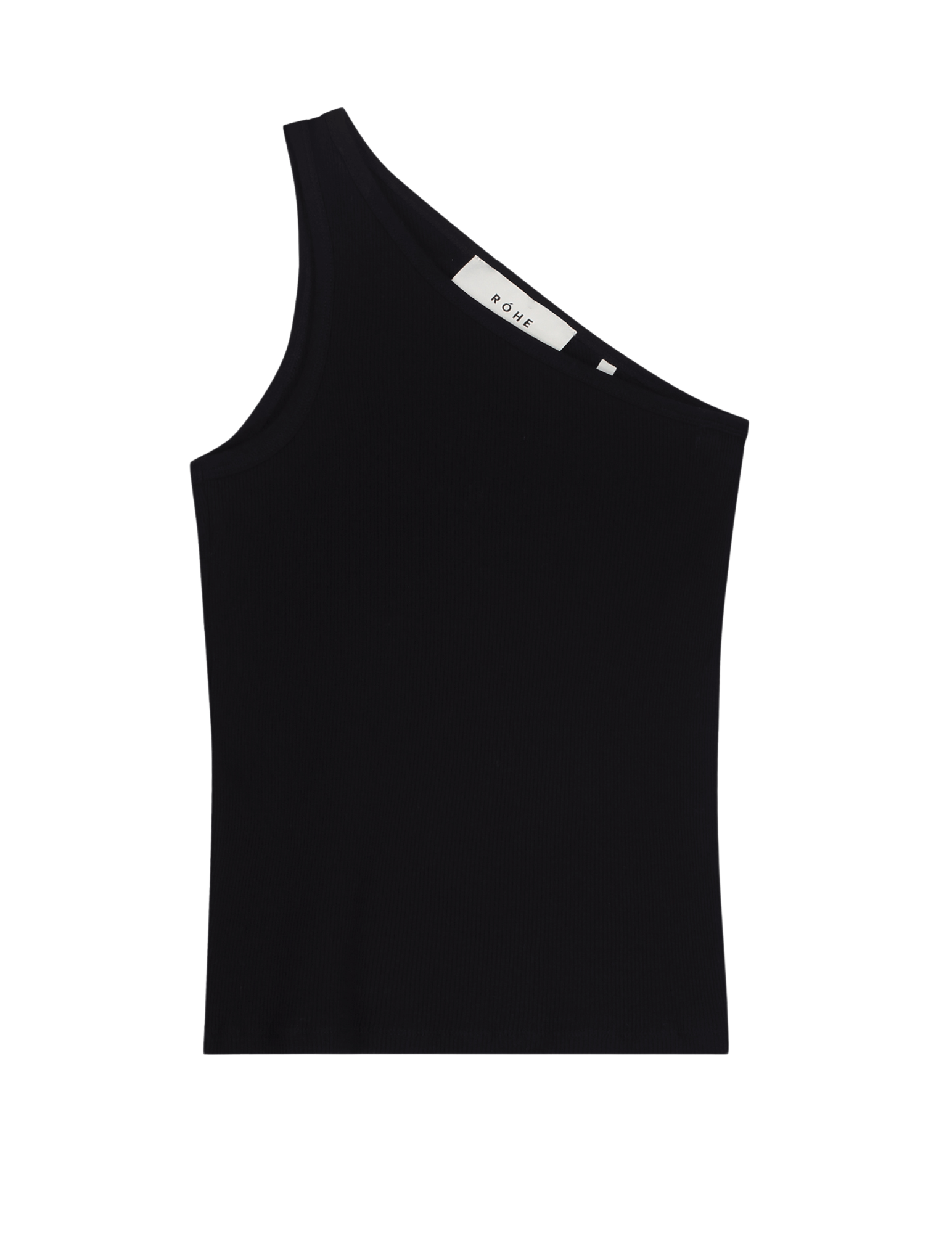 The Róhe Asymmetrical Rib Top in Noir is made from 100% Mercerised Cotton