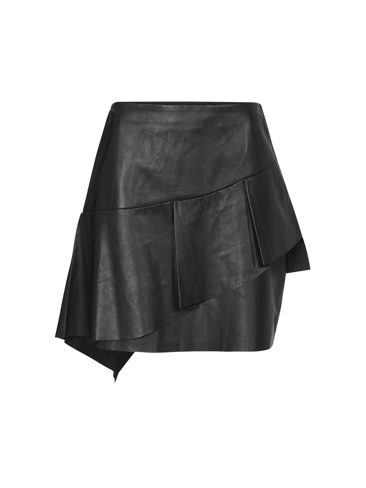 A sleek black leather mini skirt with a concealed side zip, Joie's Botan style stuns with subtle asymmetrical ruffle detail.