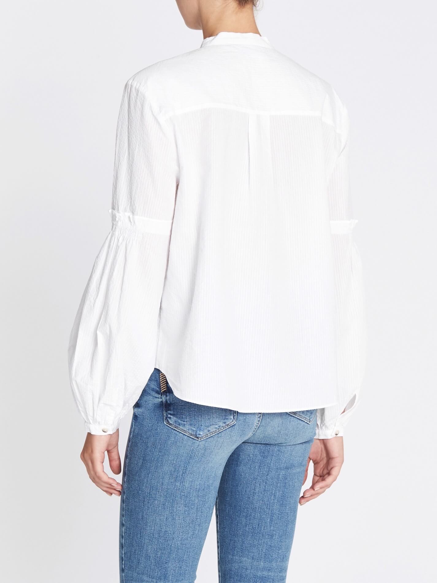 The classic white shirt get a romantic, feminine update with the M.i.h Esther Shirt in White. Constructed from a lightweight cotton this shirt features a centre front button opening, mandarin collar and is finished with subtly gathered, frilled sleeves adding an extra dimension to this must have shirt.