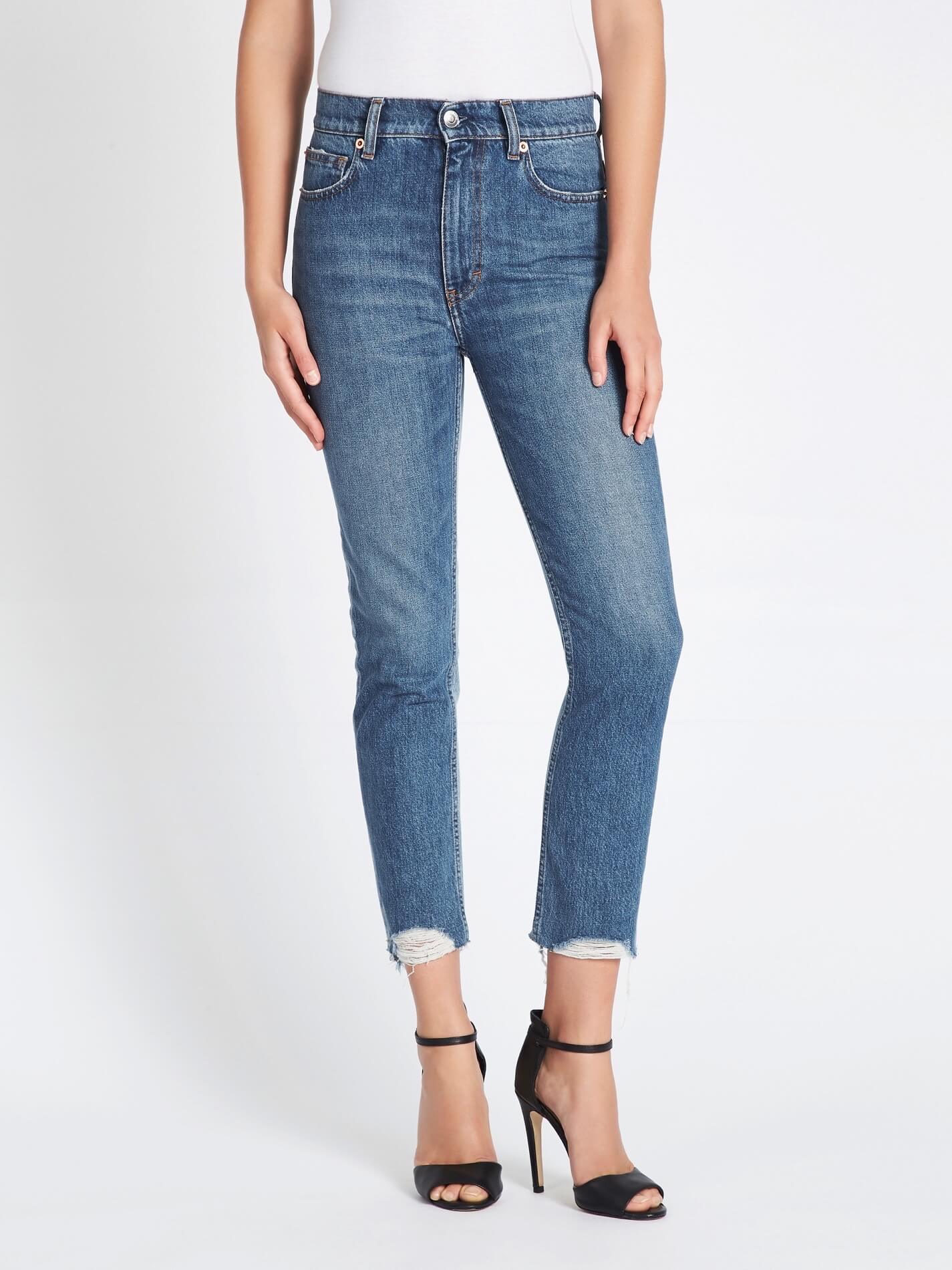A high rise jean with distressed hem detail, the IRO Jeans Argan Jean are a light blue denim wash. Detailed with silver hardware, fading and whiskering.