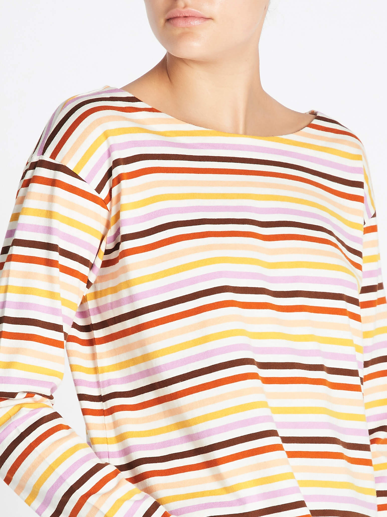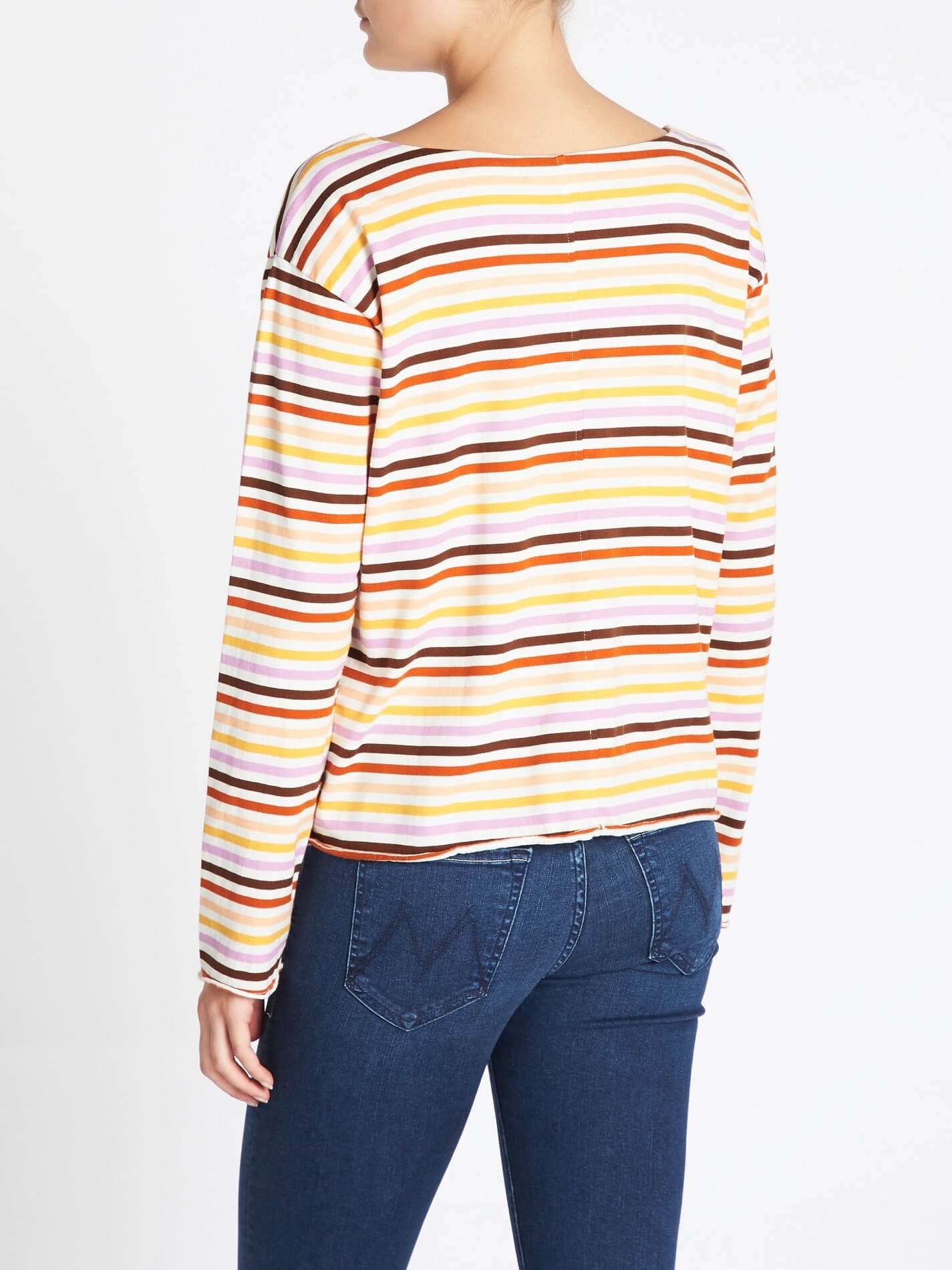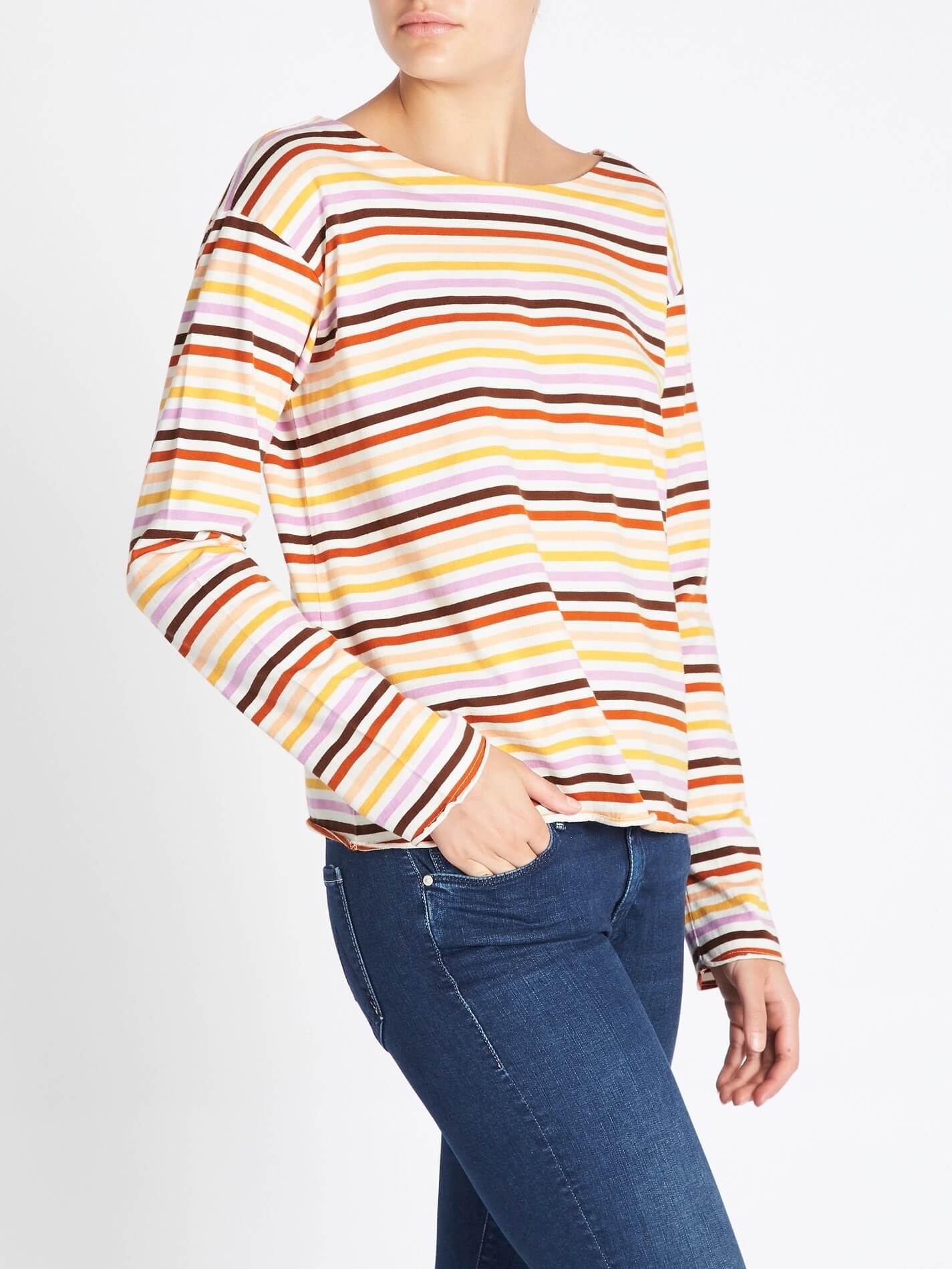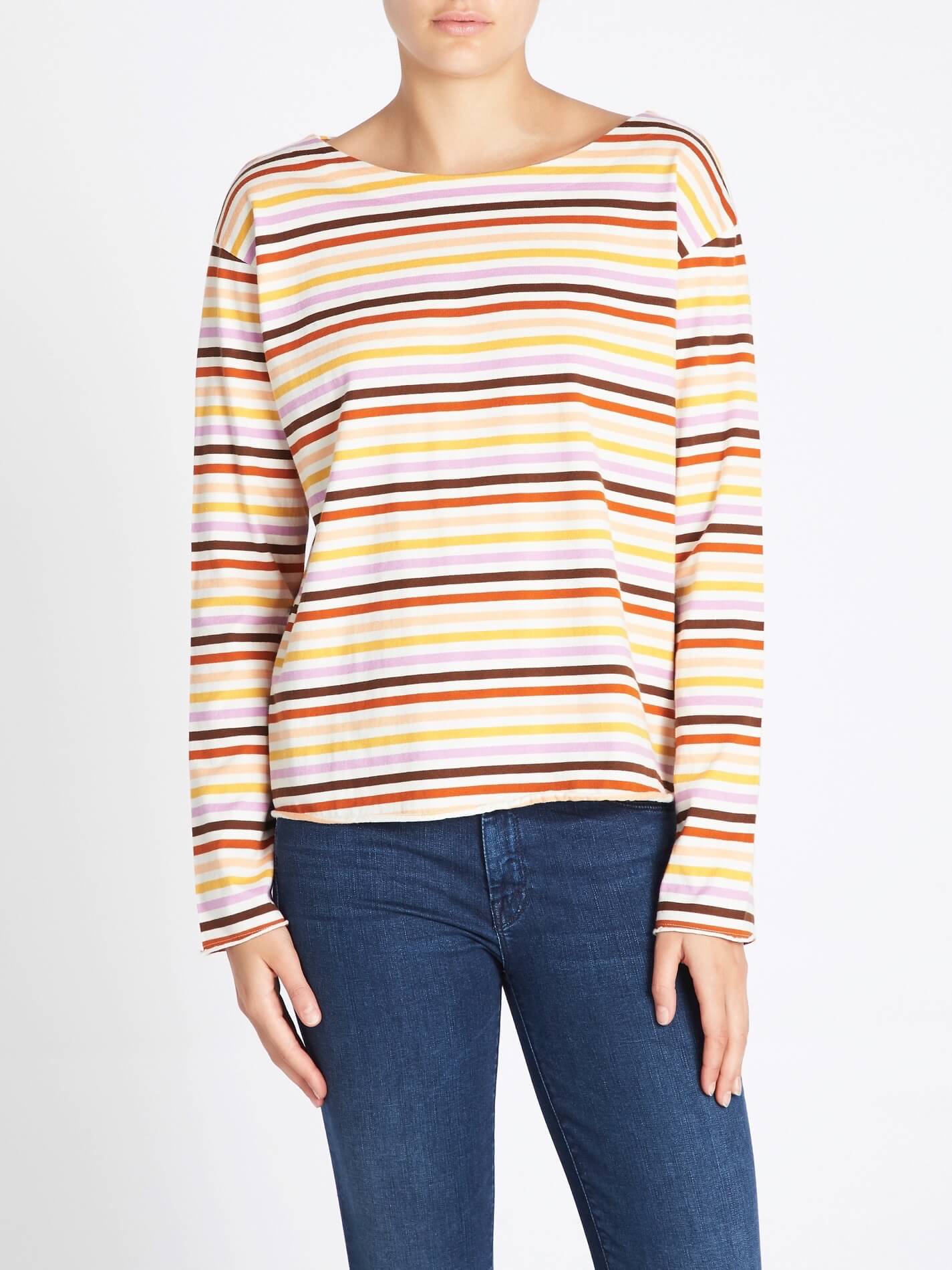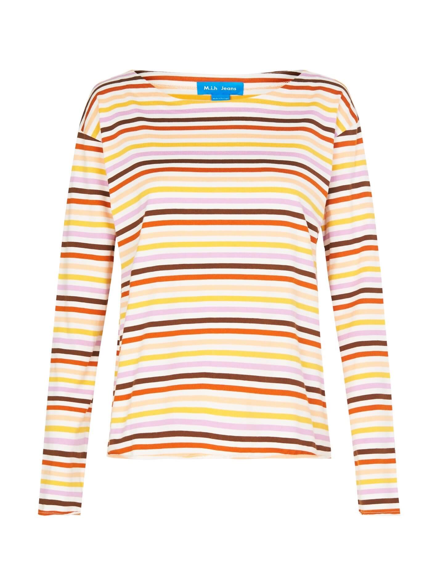 M.i.h Jeans presents the Simple Mariniere in Sunset Multi, a boxy fit jersey top that's the perfect off duty must have. Constructed from 100% cotton this multicoloured sunset inspired stripe top features long sleeves, a rounded neckline, drop shoulders and is finished with raw edges for a modern twist.