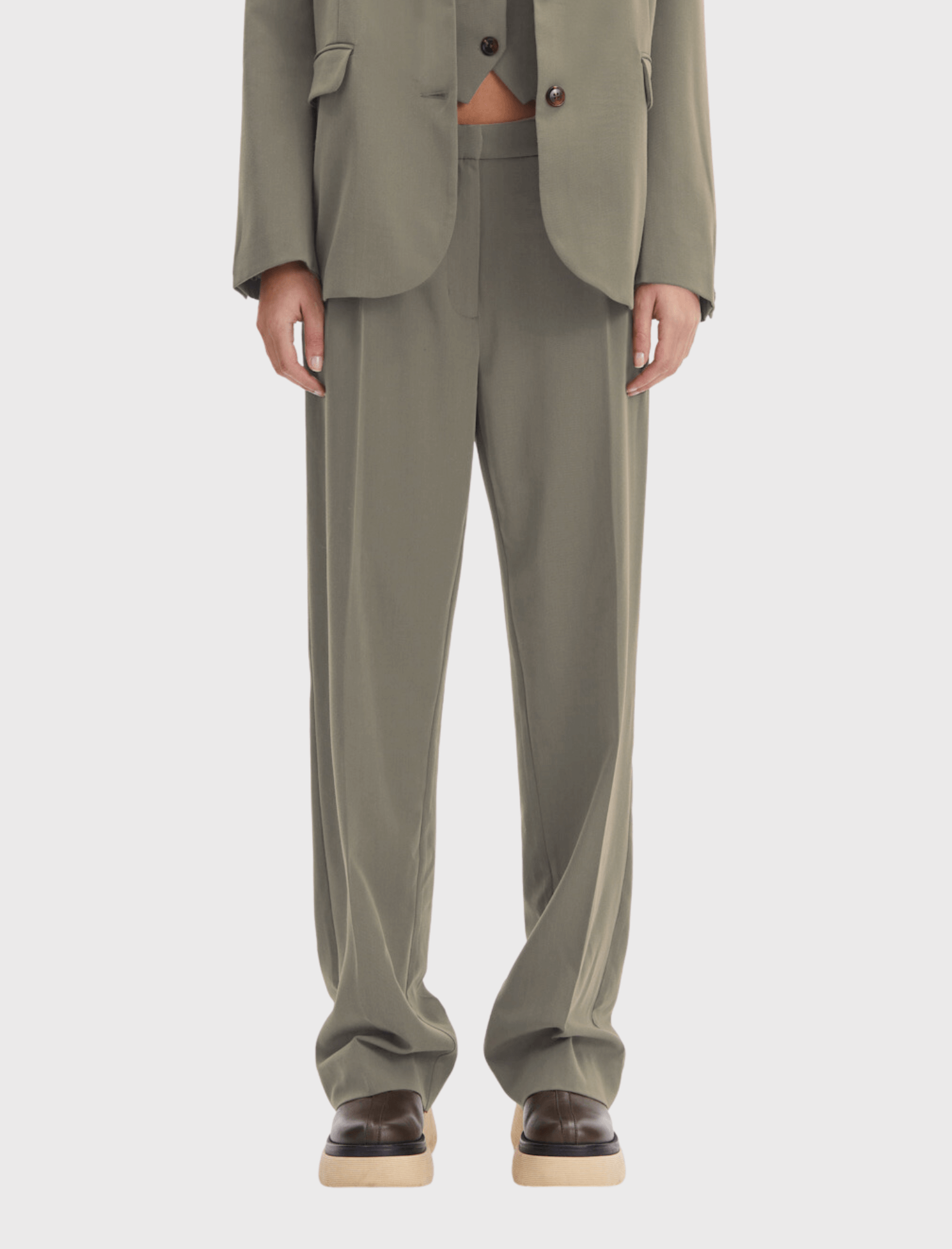 Back at it again at the forefront of sustainable fashion, Samsoe Samsoe have brought us the Ramona Trousers in Silver Sage, a creamy pale khaki colour with grey tones. These tailored trousers have a relaxed fit with front pleats. The polyester and recycled polyester blended fabric add stretch to these woven pants, which include belt loops and back welt pocket detail. Match with the Ramona Vest and Ramona Blazer for the ultimate in three-piece chic.